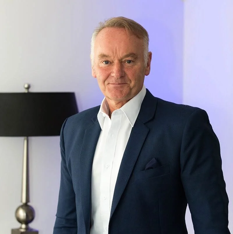 A middle-aged man in a navy blue suit and white dress shirt standing indoors with a black lamp in the background.